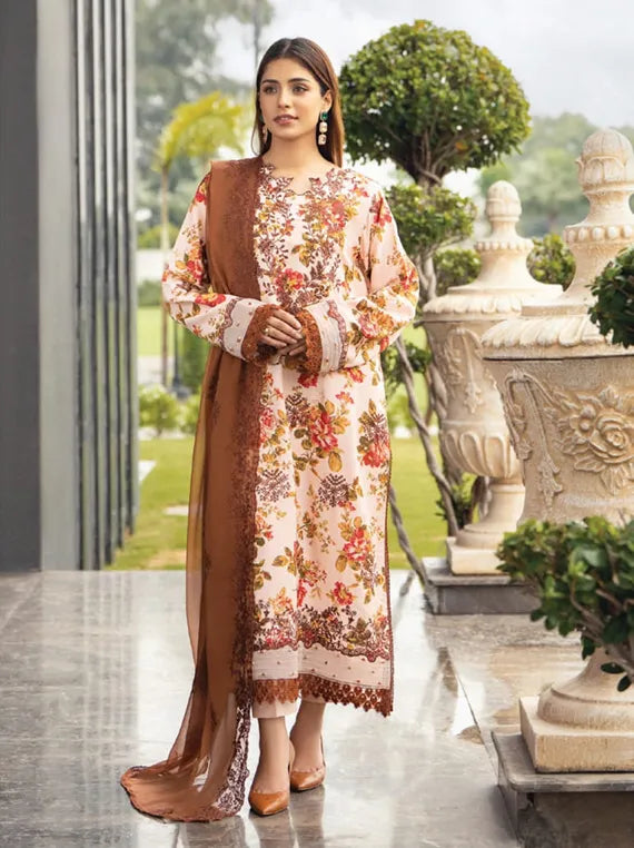 Embroidered Karandi Shirt 3 Mtrs Embroidered Chiffon Dupatta 2.5 Mtrs Plain Karandi Trouser 2.5 Mtrs