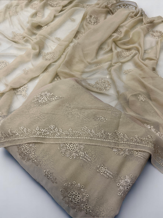 Chiffon fabric with intricate all-over embroidery, ideal for formal wear with a touch of elegance.
